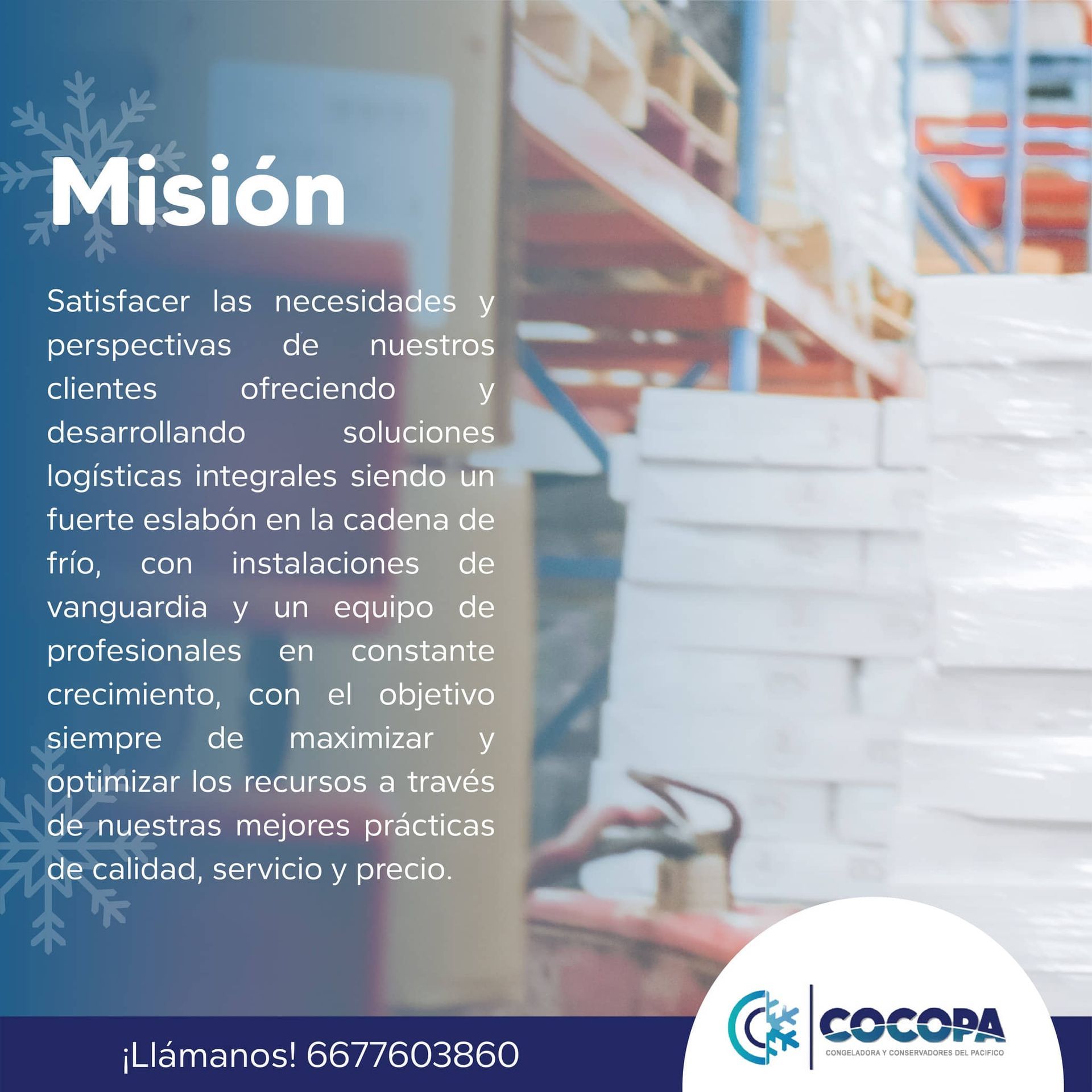Congeladora y Conservadores del Pacífico (COCOPA) es una empresa certificada y líder en logística de productos perecederos. Nos especializamos en la refrigeración y congelación de productos alimenticios en Culiacán, Sinaloa.